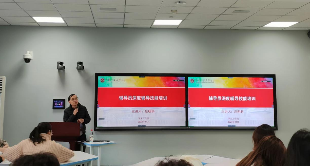 本网讯 为进一步提升我校辅导员专业化、职业化水平,加强学院开展心理健康教育工作的力度和效度,11月29日上午,学生工作处在沙河校区教1-304举办辅导员深度辅导技能专题培训,学院路教215同步线上进行。本次培训邀请到北京大学学生心理健康教育与咨询中心副主任庄明科副教授主讲,各书院(学院)辅导员及心理健康教育咨询中心专职老师等40余人,通过线下线上的方式参加了培训。培训由学生工作处副处长谷博主持。