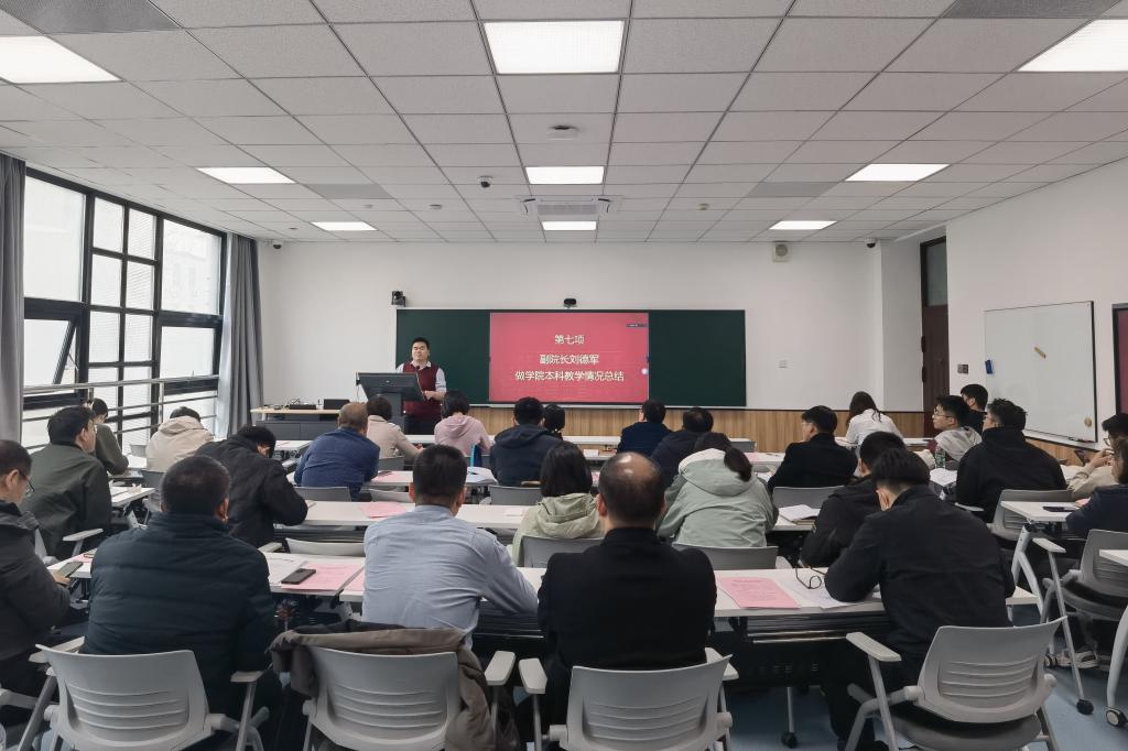 学院副院长刘德军做本科教学情况总结。他指出当前学生存在考试基础知识掌握不扎实、高年级学生课堂出勤率不高、学生考试违纪情况严重等问题。他强调,任课老师要适当更改工作方式,提高教学质量,适应时代发展。他指出,加强学风建设需要靠各方的共同努力,学院要加强“双导并驱”工作,深度了解学生帮助学生。