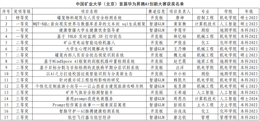 大赛自9月启动以来,受到了同学们的广泛关注,近40支团队踊跃报名。同学们无畏困难、勇于探索,结合所学专业和学校特色,在AI的世界里乘风踏浪、驰骋星海。最终17支队伍晋级决赛,作品涵盖矿山安全、矿山智能巡检、3D打印、校园垃圾分类、大学生心理健康等,充分展示了同学们的创新能力和实践成果。经过紧张的答辩与提问环节,最终“罐笼物料超限与人员安全检测系统”团队荣获特等奖,“基于YOLO实时监测3D打印状态”等3支团队荣获一等奖,“矿山变电站智能巡检机器人”等5支团队荣获二等奖,“以AI之力打造校园垃圾智能识别与分类新生态”等8支团队荣获三等奖。