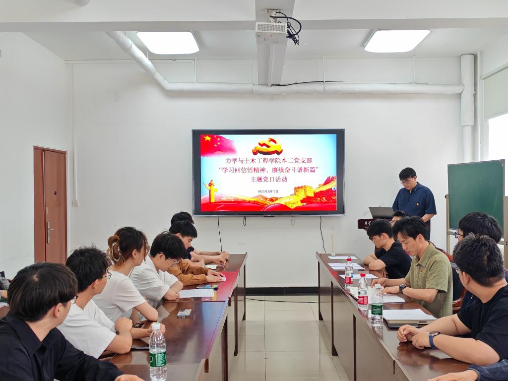 本网讯 5月16日,力学与土木工程学院本科生第二党支部召开“学习回信悟精神,赓续奋斗谱新篇”主题党日活动,以推进北京市高校党建工作样板支部培育建设,落实“3+1+N”理论学习制度。学院党委专职组织员、支部理论导师艾博到会指导,支部书记李鑫主持会议。全体党员、发展对象和积极分子代表等41人参加会议