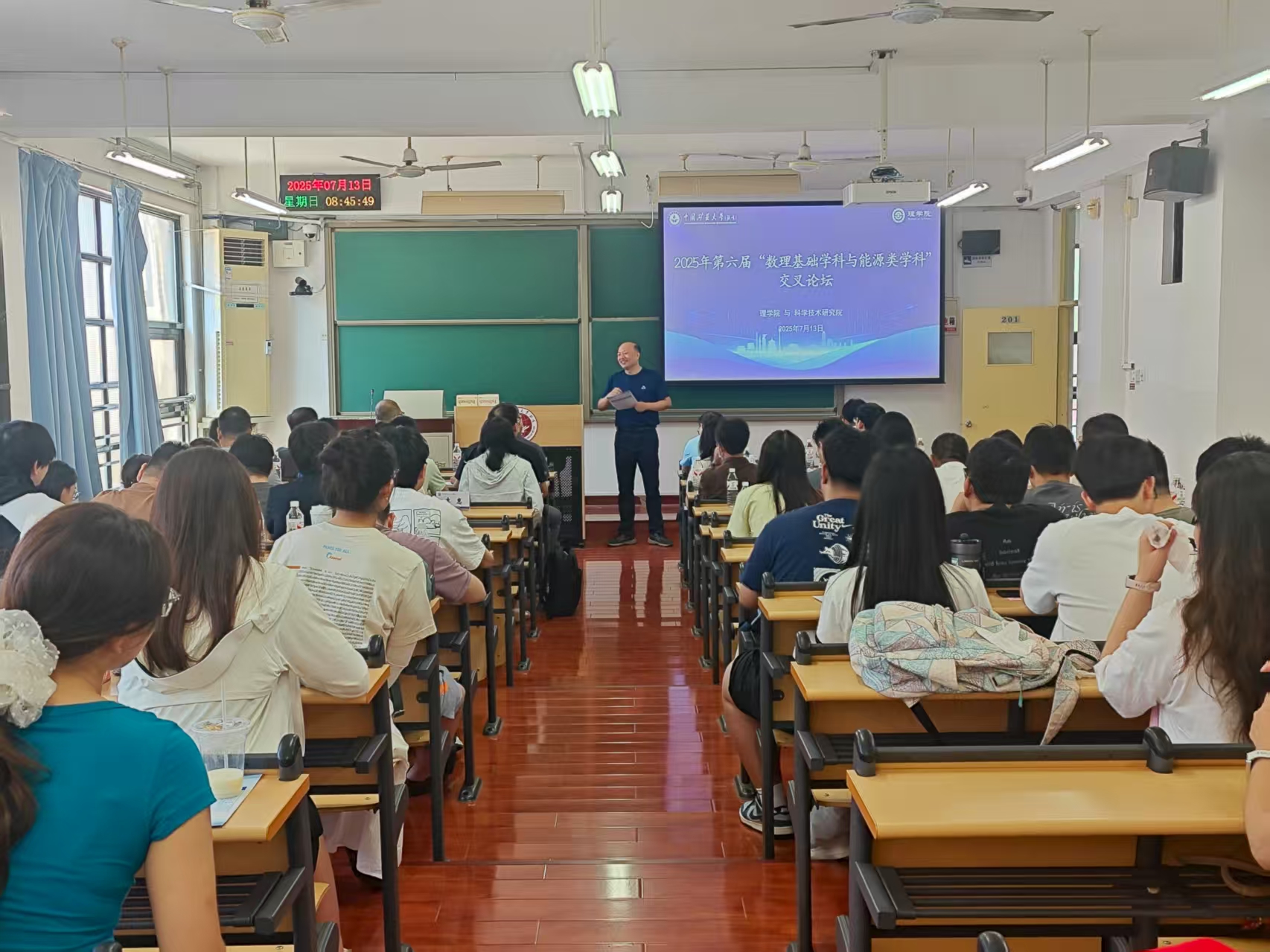 本网讯 7月13日,第六届“数理基础学科与矿业能源类学科”交叉论坛在中国矿业大学(北京)学院路校区教201成功举办。本次论坛由理学院与科学技术研究院联合主办,旨在推动数理基础学科与矿业能源等优势工科的深度交叉融合。科学技术研究院副院长刘瑞平、研究生院副院长蒋金豹出席会议,矿业能源类领域的8名专家分享各自领域的研究成果。理学院院长李再兴、党委书记张蕊、副院长郭春晓、党委副书记张殿勋,以及理学院各系主任、教师、学生近70人参加了此次论坛。论坛开幕式由李再兴主持。