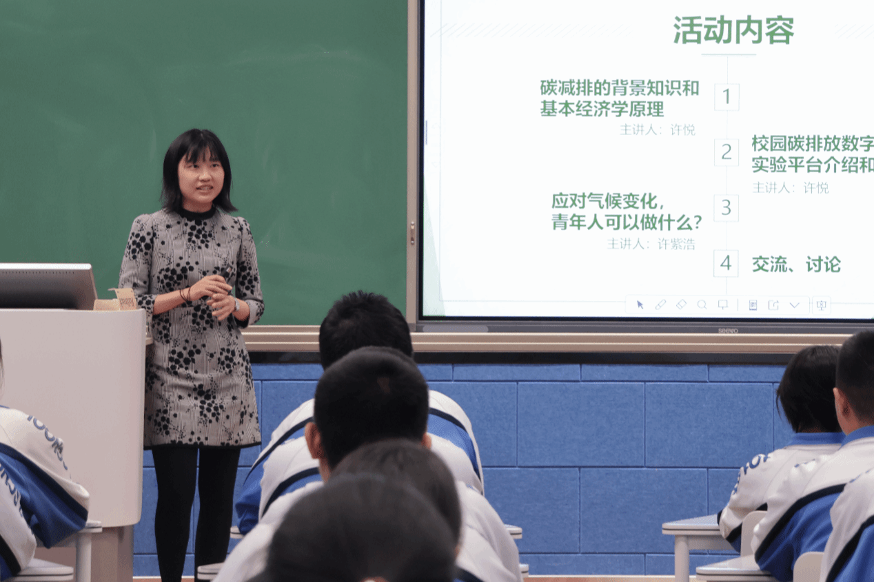 许悦围绕全球气候变化的背景、碳减排机制的经济学原理、中国的减排目标和碳交易机制等内容展开讲解,让同学们了解碳减排的必要性,感受中国在应对气候变化方面所体现的大国担当精神,并形成对碳市场的初步认识。同时介绍了由学院研发的校园碳排放数字化管理仿真实验平台,让同学们感受到能碳可视化监控技术助力校园碳减排的重要性。