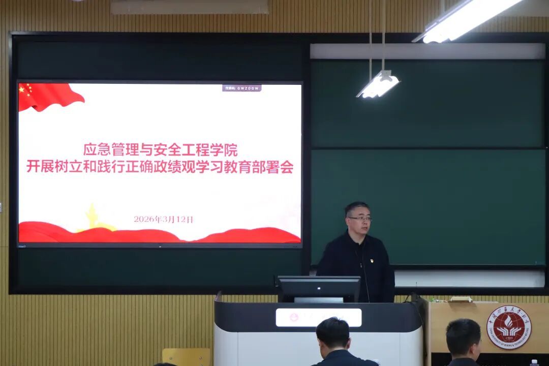 会上,党委书记杨庆舟传达中央、教育部及学校党委关于开展树立和践行正确政绩观学习教育的相关工作部署,解读了《应急管理与安全工程学院开展树立和践行正确政绩观学习教育重点任务安排》。他强调,2026年是“十五五”规划开局起步的关键节点,全院师生要提高政治站位,深刻认识开展树立和践行正确政绩观学习教育的重大政治意义和实践意义,牢牢把握“立党为公、为民造福、科学决策、真抓实干”总要求,结合学科特色,切实把正确政绩观融入办学治院全过程各方面。