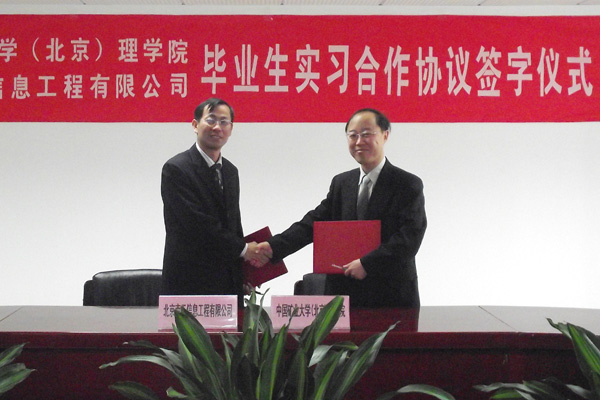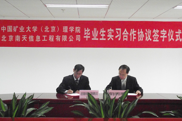 随后,刘青平与胡其竹共同签订理学院与北京南天信息工程有限公司毕业生实习合作协议。