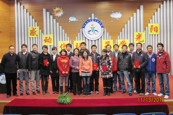 为树立优秀学子典型,营造良好学习氛围,11月13日晚,化环学院在民族楼407举办了第三届“感动化环、阳光学子”评选暨颁奖典礼。院党总支书记卢梅、副院长王启宝、团委书记王更玉、各年级辅导员到场参加了颁奖典礼。