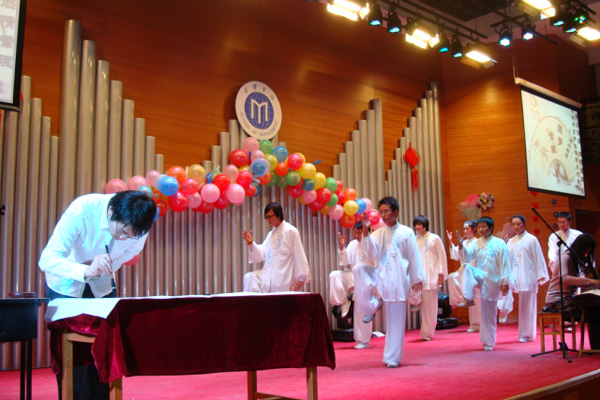 圆梦管理的篇章中,袅袅的钢琴声淡淡的划过舞台,弥漫在所有人的心间时,李姝等5位同学献上配乐诗朗诵《舞者的赞歌》,观众的心绪被带动了起来,聆听着他们的朗诵,感受着矿大百年的文化底蕴,矿大的精神伴着温柔的钢琴声缓缓流过,通过空气触动着在场每一位学子的灵魂。太极伴着古筝的音乐、书法的韵味缓缓展开,向观众们诠释着中国传统文化的内涵。流行歌曲串唱,飘向全场观众的心中,勾起一串串缠绵悱恻的回忆,在心湖中漾起一圈圈涟漪,台上演员深情演绎,台下观众温情聆听,博得阵阵喝彩。在一阵动感十足的音乐过后,晚会进入另一拨高潮。《歌舞青春》一个完全由学生创新的节目,一个展现自己的节目,一个秀出自己的节目。看台上,灯光迷离,一个个演员用舞姿展示着青春与活力;台下,观众们群起欢呼,一位位观众变成欢乐的精灵,和着音乐打节拍。