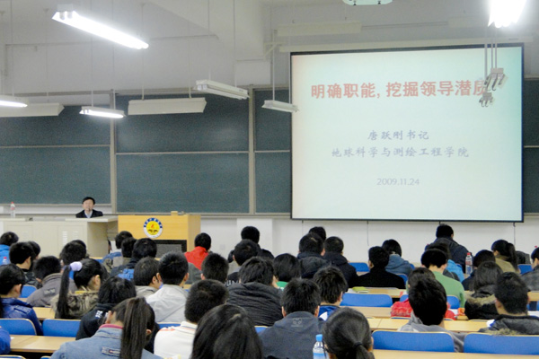 11月24日下午,地球科学与测绘工程学院在教学楼B114举办了第一期学生干部培训班。院党总支书唐跃刚、党总支副书记鲍玲、团委书记张蕊、所有辅导员老师,全体学生干部参加了培训。培训由张蕊主持。