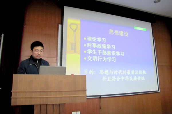 会上,安宇从学院组织结构、学生工作思路、学生干部队伍建设进行了系统讲述。他指出,学院学生工作的思路是以学风建设为中心,抓好队伍建设和制度建设,重点做好安全稳定、评优和就业三项工作。在谈到学生干部队伍建设时,他从思想建设、组织建设和作风建设进行了讲解。他指出,学生干部应加强理论学习、时事政策学习以及文明行为学习,使自己的思想与时代的最前沿接轨并且符合中华民族传统。组织建设是学生干部队伍良性发展的保障,应加大对学生干部队伍的培养、管理和评比等工作,加大学生干部队伍的梯队建设。作风建设关系到学生干部队伍的健康成长,学生干部要做到充满热情、责任心强、具有时间观念、乐于奉献;在心理上要冷静、自信、宽容大度;在能力方面要具备组织协调能力、突发事件的应急处理能力、信息的收集和反馈能力和较强的语言文字表达能力;在个人意识上要具有沟通意识、服务意识、大局意识和创新意识。