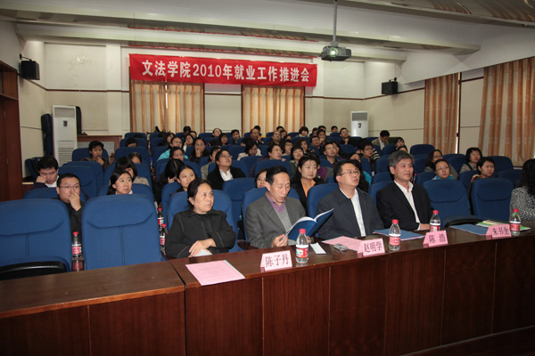 10月27日下午,“文法学院2010年就业工作推进会”在民族楼135报告厅召开。校党委副书记朱书全,校学生工处处长陈浩,文法学院党总支部书记田霞,院长赵明学,院党总支副书记李妍副以及文法学院全体老师出席会议,研究生毕业生及本科毕业生参加了会议。