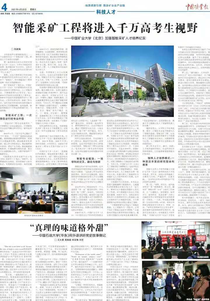 2021年,中国矿业大学(北京)新增智能采矿工程、应急技术与管理、人工智能、大数据管理与应用等4个本科招生专业。日前,《中国矿业报》以“智能采矿工程将进入千万高考生视野——中国矿业大学(北京)加强智能采矿人才培养纪实”为题,进行相关报道。