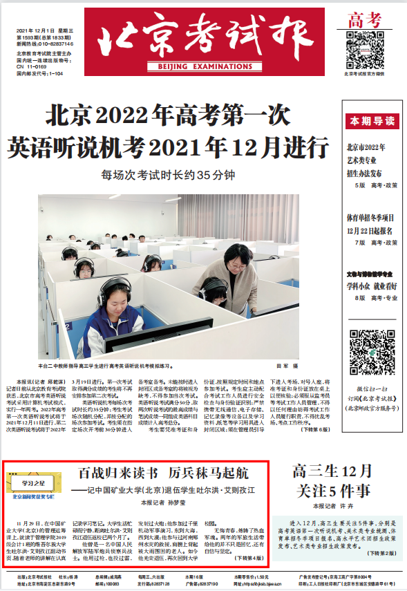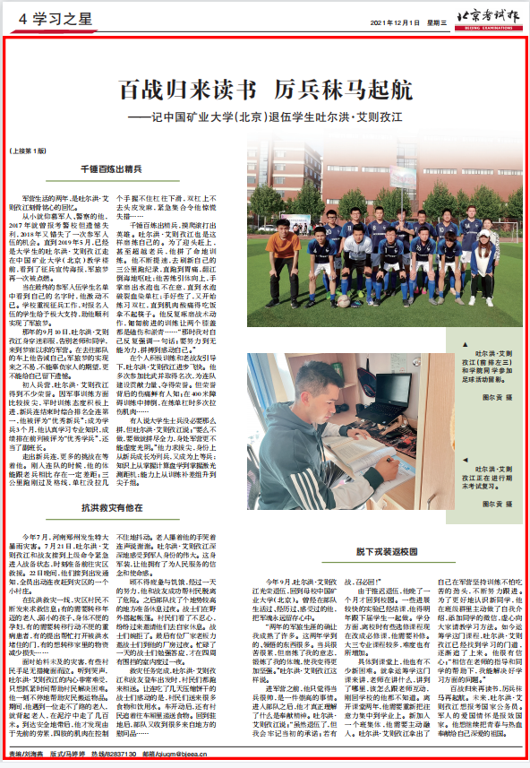 今年9月,吐尔洪·艾则孜江光荣退伍,回到母校中国矿业大学(北京)。曾经在部队生活过、经历过、感受过的他,把军魂永远留存心中。