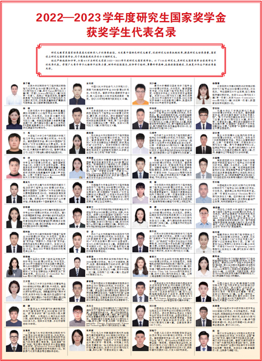 经过严格选拔和评审,全国4.5万名研究生荣获2022—2023学年度研究生国家奖学金。以下100名研究生,是研究生国家奖学金获奖学生中的优秀代表。希望广大青年学子从榜样中汲取力量,树牢科技报国志,刻苦学习钻研,勇攀科学高峰,在推进强国建设、民族复兴伟业中绽放青春光彩。