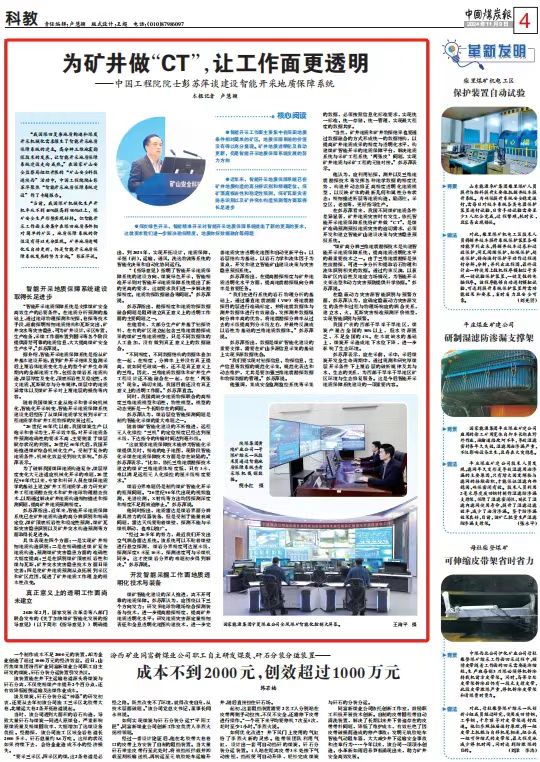 【中国煤炭报】为矿井做“CT”,让工作面更透明——中国工程院院士彭苏萍谈建设智能开采地质保障系统