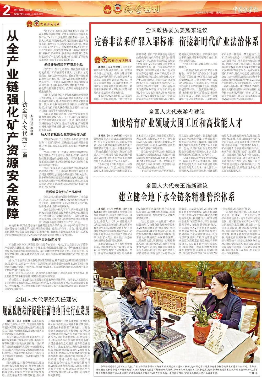 【中国矿业报】全国政协委员姜耀东建议:完善非法采矿罪入罪标准 衔接新时代矿业法治体系
