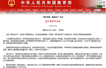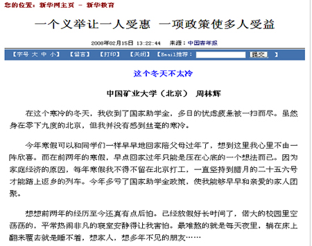 在这个寒冷的冬天,我收到了国家助学金,多日的忧虑疲惫被一扫而尽。虽然身在零下九度的北京,但我并没有感到丝毫的寒冷。
