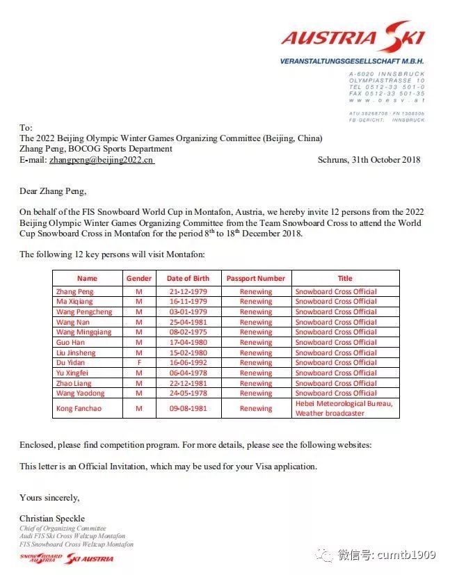 国际雪联的邀请函