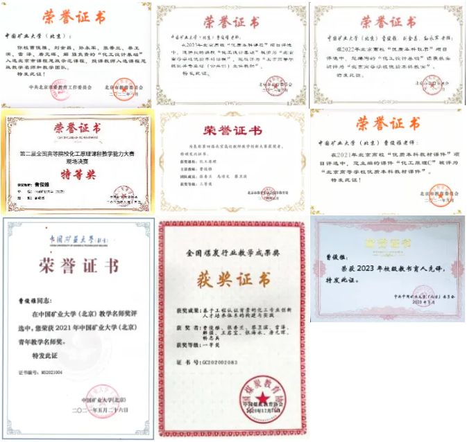 她不断改进创新教育教学方法,教学能力和水平受到校内外广泛认可,先后获评北京市思政教学名师、北京高校优质本科课程主讲教师、校青年名师和教书育人先锋等荣誉称号,在全国化工原理教学能力决赛中获特等奖,在北京市教学创新比赛中荣获三等奖。