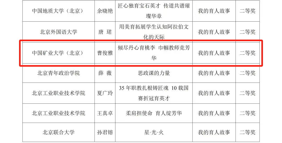 第40个教师节来临之际,由教育部、中国教育学会指导,北京市委教育工委、北京市教委主办,北京市学校德育研究会承办的“为党育人 为国育才——第六届北京市大中小幼教师讲述育人故事展示交流活动”举行。中国矿业大学(北京)化学与环境工程学院曹俊雅教授荣获二等奖。在学校“我身边的好老师”评选活动中,曹俊雅教授获“我身边的好老师”称号。