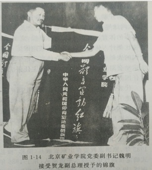 (图为北京矿业学院党委副书记魏明接受贺龙副总理授予的锦旗)