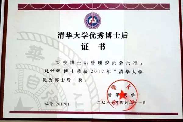 博士后第一年结束,他在中期考核时获得本专业唯一的优秀名额,被评为院系第一,并获得清华大学院系推选优秀博士后资格。2017年,赵计辉参加了清华大学优秀博士后答辩,与全校不同院系推选出来的优秀学生竞争,评委是清华大学各院资深专家。他自信又饱满热情地介绍了自己具有创新性和学术贡献性的研究工作和研究成果。
