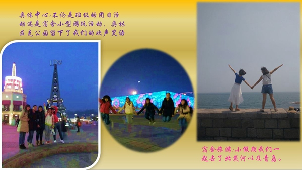 加强学风建设,宿舍创立每日睡前解疑环节,期末互相提问巩固知识点。在2014-2015、2015-2016两年度奖学金评选中,宿舍6名成员全体都获得奖学金,一人获国家励志奖学金、校二等奖学金和校董事会奖学金,一人两次获励志奖学金和校二等奖学金,二人两次获三等奖学金,其余两人一次获三等奖学金。宿舍四级通过率100%。同时宿舍特别重视宿舍环境建设。宿舍装饰温馨,每天保持整洁干净。宿舍成员坚持每天整理内务,养成了积极、健康、向上的生活习惯和持之以恒的精神。宿舍成员积极参加班级、学院、学校集体活动。在团日活动中,全员参与,见证了彼此的友谊。在女生节中,宿舍被评为“最佳寝室文化奖”。2015年被评为“百炼之星”宿舍。在每个节假日和宿舍成员的生日,宿舍都会组织集体出游,提高宿舍凝聚力。宿舍成员积极参加学科竞赛,一人获校物理竞赛二等奖,一人获校建模竞赛三等奖。同时,宿舍成员积极参加国家、北京市和学校组织的各类文体活动,为她们自己搭建锻炼的平台。一人获全国乒乓球光明杯二等奖、北京高校杯混合双打第二名、北京高校杯团体第二名;在校趣味活动中,三人获校园解谜大赛一等奖;在百科知识竞赛中,一人获二等奖;校运会中一人获校运动会800米第二名,4*100第三名;校万米接力中,宿舍助学院拿到第三名;宿舍成员也多次获得各类奖项,如校园征文比赛三等奖,院新生辩论团体冠军。宿舍成员还积极参加志愿活动,如扶贫基金会的“善行者”活动、校温暖衣冬活动。