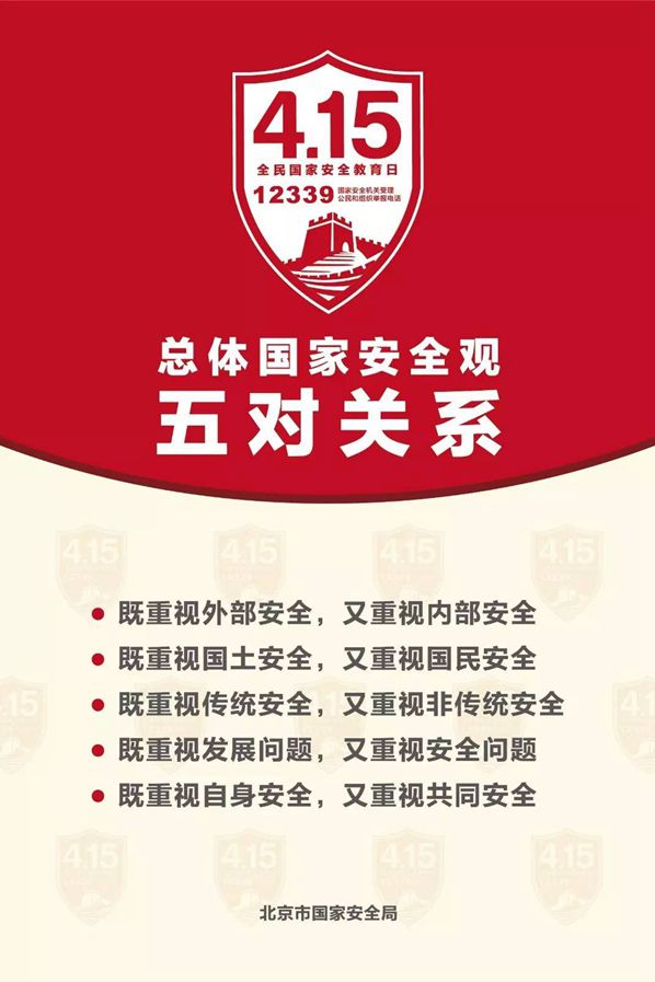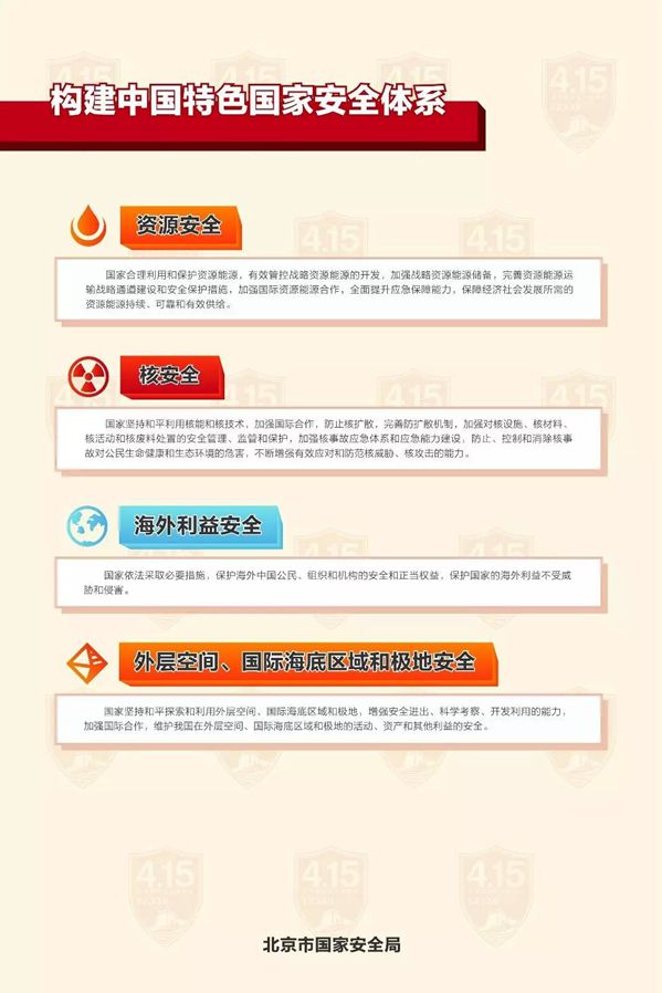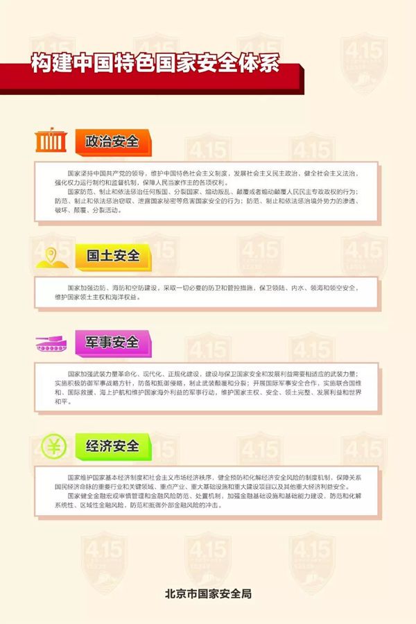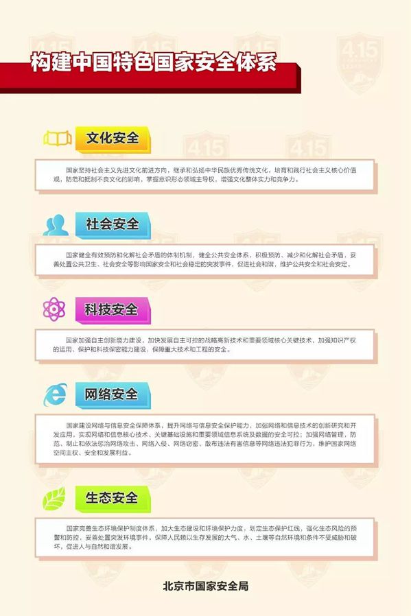 2015年7月1日通过并公布施行的新国家安全法,这是一部全新的国家安全法,是一部综合性、全局性、基础性的国家安全法,涵盖了国家安全各个领域的内容,法律对国家政治安全、国土安全、军事安全、经济安全、文化安全、社会安全、科技安全、信息安全、生态安全、资源安全、核安全等11个领域的国家安全任务进行了明确,构建起集11个领域于一体的国家安全体系和总体国家安全观。确保国家安全和长治久安,需要久久为功、驰而不息的不懈努力。全民国家安全教育日的到来。让国家安全意识在全体人民心中生根发芽,让13亿人民成为国家安全的坚定维护者,我们必将推动中华号巨轮在时代风云中破浪前行,为实现“两个一百年”奋斗目标、实现中华民族伟大复兴中国梦筑牢安全保障。