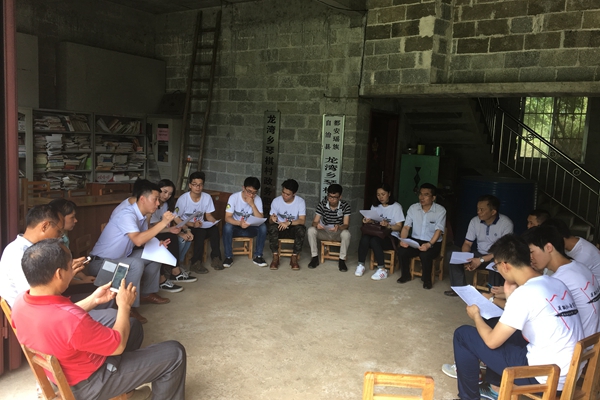 29日下午,实践团一行和都安县、龙湾乡、琴棋村的相关领导召开“精准扶贫”座谈会。我校挂职干部、琴棋村第一书记孙铭晗,琴棋村党支部书记兼村委会主任黄炳康汇报了近年来琴棋村的脱贫攻坚工作、我校开展的定点帮扶项目和运营百香果园合作社技术上的诉求,其中黄炳康代表全体村民向中国矿业大学(北京)对琴棋村的深情厚谊和大力帮扶表示衷心的感谢。龙湾乡常务副乡长韦崇凯、都安县人大常委会副主任梁林分别就龙湾乡和都安县的基本情况、贫困原因和脱贫方式等作了详细介绍。校团委书记张蕊表示琴棋村是我校定点帮扶的贫困村,实践团的学生代表将尽最大努力对琴棋村提出的诉求展开帮助。王忠强在会上指出,尽管学校目前面临新校区建设的经济困难,但学校依然会坚持落实党中央和教育部安排的定点扶贫工作,尽最大的能力在选派干部挂职、捐资修路、教育资助、产业发展等方面提供帮扶。他强调,希望中国矿业大学(北京)“艰苦奋斗的创业精神和迎难而上的拼搏精神”与都安县“雄心征服千层岭,壮志压倒万重山”的都安精神休戚与共,双方共同努力改变琴棋村贫困面貌,争取如期脱贫摘帽,与全国人民同步小康。
