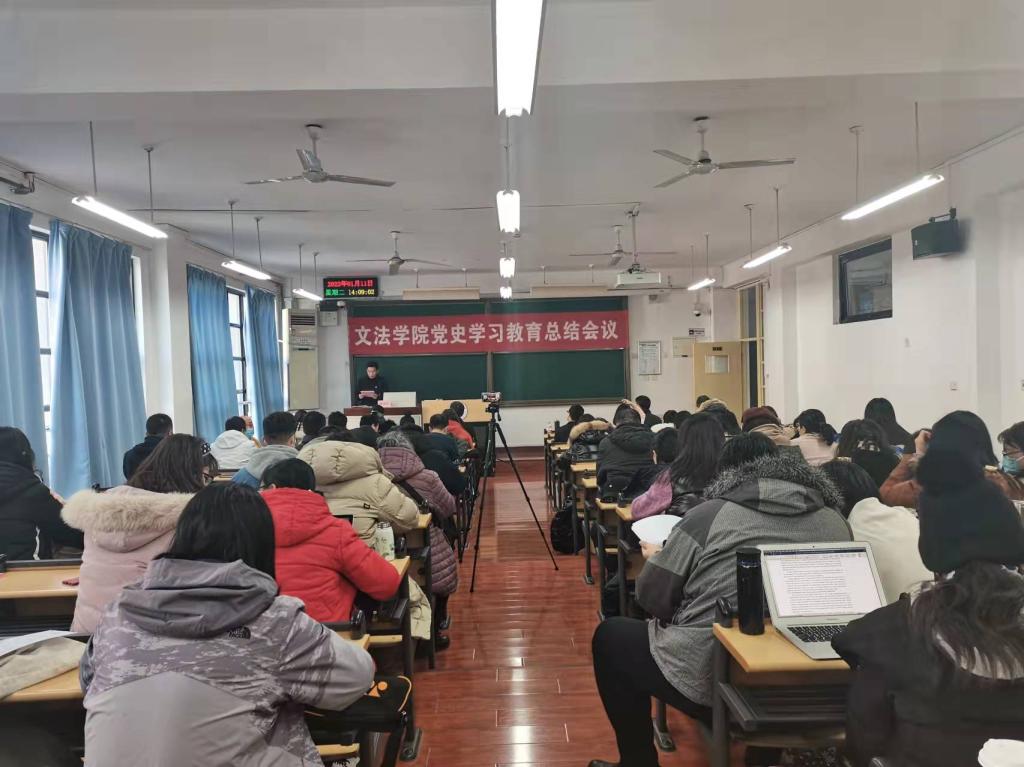 本网讯 2022年1月11日下午,文法学院在学院路校区教学楼216召开党史学习教育总结大会。学校党史学习教育第三巡回指导组组长、校纪委副书记、监察处处长胡喜宽,文法学院院长殷召良,院党委书记杨洪兵,副院长许卉艳,副院长刘金程,副院长谭爽出席会议,全院教职工、学生党员代表、学生代表共100余人通过线下、线上方式参加会议。杨洪兵作总结讲话。殷召良主持会议。