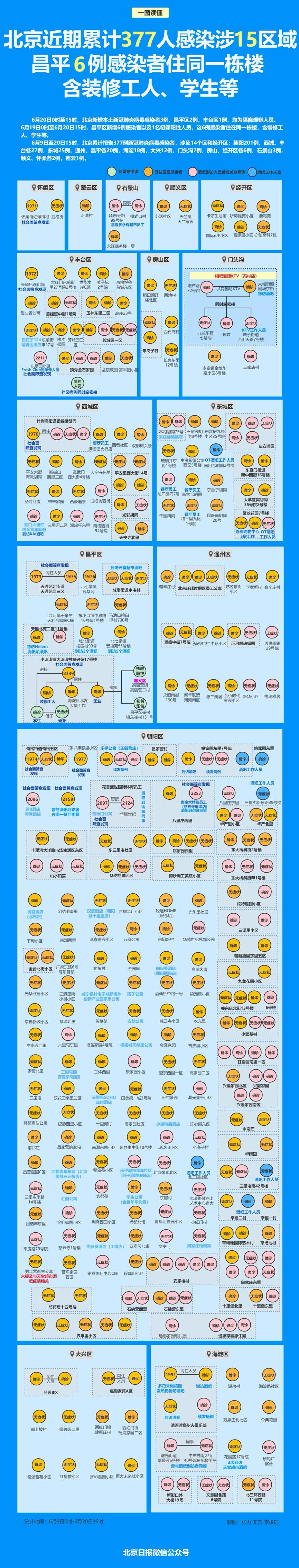 6月9日至20日15时,北京累计报告377例新冠肺炎病毒感染者。涉及14个区和经开区,其中,朝阳区201例,西城区、丰台区各27例,东城区25例,通州区、昌平区各20例,海淀区18例,大兴区12例,门头沟区7例,房山区、经开区各6例,石景山区3例,顺义区、怀柔区各2例,密云区1例。