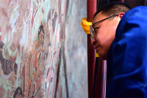 在莫高窟第231窟,敦煌研究院文物保护技术服务中心的壁画修复工作者在修复出现病害的壁画。