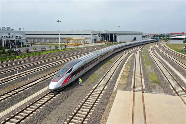 在位于山东青岛的中车四方股份公司,一辆复兴号列车正在出厂。