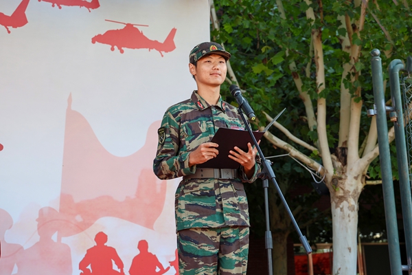 方希诺同学代表全体参训同学发言,他回顾了难忘而深刻的军训生活,对学校、教官、指导员、后勤保障人员等致以崇高敬意和真诚感谢。他表示,将沿袭在军训中养成的优秀品质,在未来的学习生活中不懈奋斗,以饱满的热情和坚定的信念踏上未来的征程。