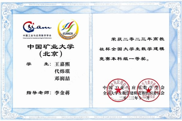 王嘉熙,男,中共党员,中国矿业大学(北京)理学院信息与计算科学专业21级本科生,保研至厦门大学统计学与数据科学系。大学四年综合成绩89.37,排名专业第三,曾任班级团支书。曾获2023年高教社杯全国大学生数学建模竞赛北京市一等奖、2023年高教社杯全国大学生数学建模竞赛全国一等奖、正大杯第十四届全国大学生市场调研与分析大赛北京市二等奖、第十五届全国大学生数学竞赛(数学A类)三等奖、北京市第三十四届大学生数学竞赛(数学专业甲组)三等奖、2021-2022学年校级一等奖学金、2022-2023学年国家励志奖学金、2023-2024学年国家奖学金、2022-2023学年优秀团员。发表CPCI检索会议论文一篇、参与家级大学生创新训练项目一项、授权一项计算机软件著作权《几何数学学习辅助交互系统V1.0》。