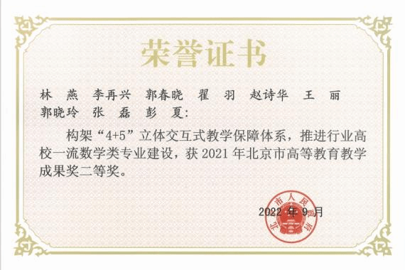 在公共课系列举措的推动下,全校学生竞赛成绩屡创新高。2023年,全国大学生数学建模竞赛中我校参赛队伍荣获全国一等奖1项、全国二等奖1项,北京市一等奖5项、北京市二等奖12项,综合获奖率接近50%,远高于赛事平均水平,取得了近年来的最佳战绩。在全国大学生数学竞赛中,我校近五年的获奖总人数位居北京市高校第六名,多位指导教师先后荣获“优秀指导教师”称号,学校连续多年被评为竞赛“优秀组织奖”。近三年,全国大学生物理竞赛、物理实验竞赛获一、二等奖15项。2022年,学院在全国大学生物理实验竞赛(创新)中一等奖数量为全国高校最高。完善的竞赛培训体系和有力的组织保障大大提升了学生在学科竞赛中的竞争力。学科竞赛活动的蓬勃开展激发了学生运用数学知识解决实际问题的热情,培养了其创新能力,为学校赢得了声誉,彰显出我校数学人才培养质量的持续提升。