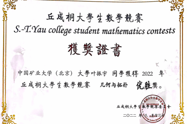 张周杰,男,中共党员,中国矿业大学(北京)理学院数学与应用数学专业21级本科生,保研至中国科学院大学数学与系统科学研究院。大学四年综合成绩91.21,排名专业第一。曾获2022中国矿业大学(北京)物理实验竞赛三等奖、2022北京市物理实验竞赛三等奖、2022北京市大学生数学竞赛(数学类甲组)二等奖、2023北京市大学生数学竞赛(数学专业甲组)二等奖、2023全国大学生数学竞赛(数学A类)三等奖、2021-2022学年国家励志奖学金、2022-2023学年国家奖学金、2023-2024学年国家励志奖学金。