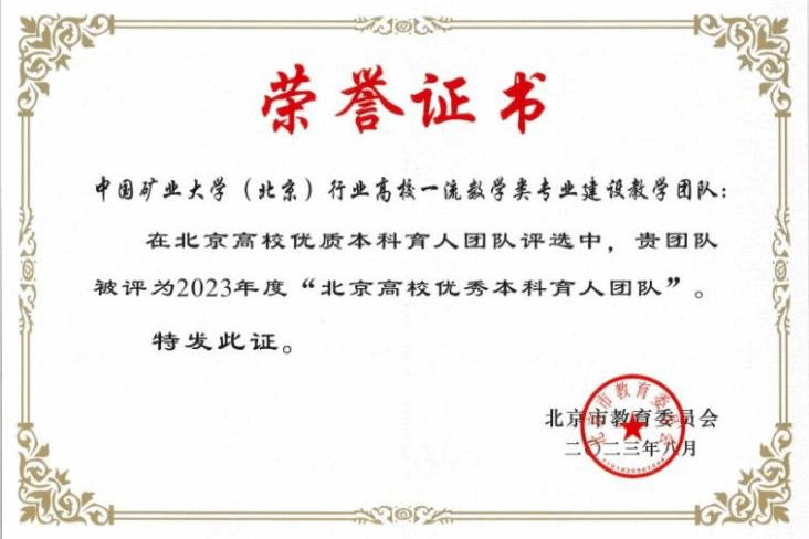 2019年,信息与计算科学本科专业荣获首批国家级一流本科专业建设点。2022年,数学与应用数学专业荣获北京市一流本科专业建设点。近些年数学教师负责与数学专业教育紧密相关的北京市教改项目和北京高等教育学会重点课题各1项,校重点项目4项。“构架‘4+5’立体交互式教学保障体系,推进行业高校一流数学类专业建设”成果荣获2022年北京市高等教育教学成果二等奖,“打造三维融合“SIP”人才培养新范式,构建行业高校“数学+”延伸发展新格局”成果荣获2024年全国煤炭行业协会教学成果二等奖。刘青平教授领衔的育人团队2023年荣获北京高校优秀本科育人团队。