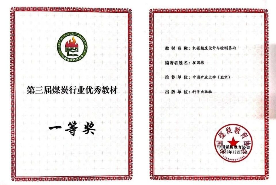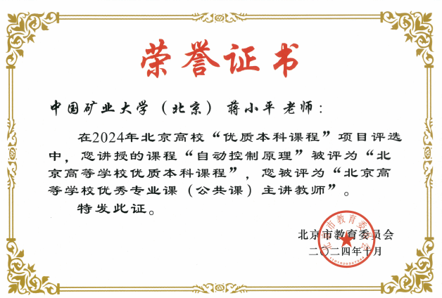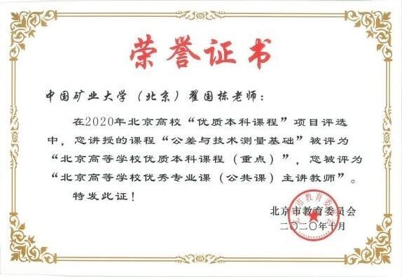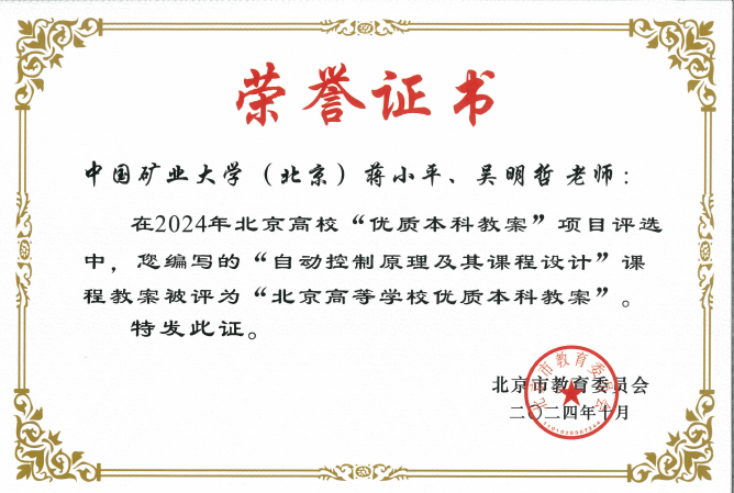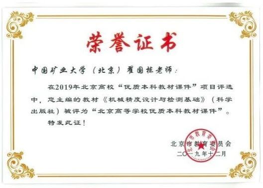 《自动控制原理》、《机械精度设计与检测基础》获北京高校优质本科教材课件;《公差与技术测量基础》、《自动控制原理》获北京高校重点优质本科课程;《自动控制原理》获北京市高等学校优质教案,实现了北京市优质本科教材、课件、教案的全覆盖。