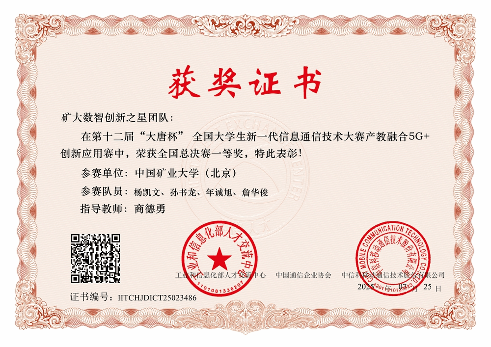 6.柯昌徽,中共党员,中国矿业大学(北京)电气工程及其自动化专业2021级本科生,北京市优秀毕业生,国家奖学金获得者,以专业第一的成绩保送至华中科技大学攻读硕士学位。本科期间获各类荣誉超20项,本科毕业设计获评校级优秀本科毕业设计(论文)一等奖,曾获校级特等奖学金(连续三年)、龙软科技智慧矿山卓越奖学金,曾获全国大学生数学建模竞赛北京赛区一等奖、全国大学生数学竞赛一等奖、团体程序设计天梯赛全国总决赛团队三等奖。作为集体成员,所在团支部曾获评校级先进团支部,所在班级曾获评校级优良学风班,所在宿舍曾获评校级优良学风宿舍。积极投身志愿服务与社会实践,曾获评中国矿业大学(北京)2023 年大学生暑期社会实践先进个人,作为副领队参与的机电学院赴京“造炬成阳”社会实践团荣获优秀团队、优秀报告一等奖。