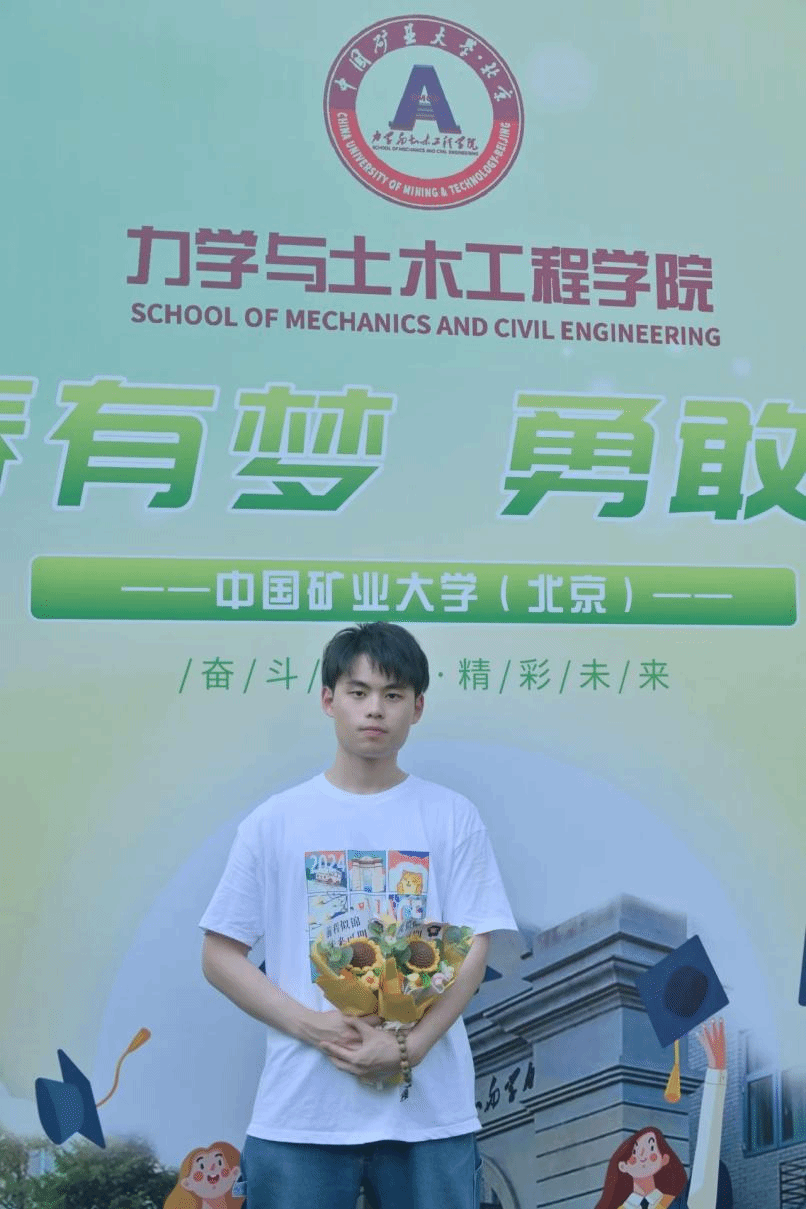 赵昱涵,男,中共党员,中国矿业大学(北京)力学与土木工程学院土木工程专业2021级本科生,直博至上海交通大学船舶海洋与建筑工程学院攻读土木工程博士学位。大学四年学习成绩91.34,排名专业第一。曾获两次国家奖学金、两次校级特等奖学金、孙越崎奖学金、“北京市三好学生”荣誉称号、北京市优秀毕业生、校级优秀团员、第十四届全国大学生数学竞赛(非数学类)一等奖、第九届中国国际“互联网+”大学生创新创业大赛(北京赛区)二等奖、大学生暑期社会实践优秀报告一等奖、优秀毕业设计一等奖等。以第二作者发表论文一篇(已录用)、申请发明专利三项(已公开);担任班级学习委员职务;前往澳门科技大学交流学习一个学期。