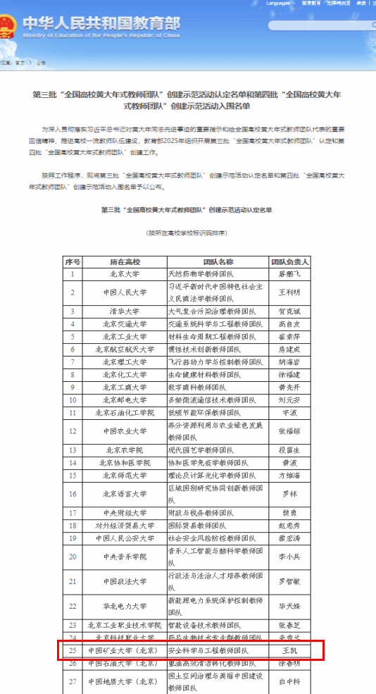 本网讯 近日,教育部公布了第三批“全国高校黄大年式教师团队”创建示范活动认定名单和第四批“全国高校黄大年式教师团队”创建示范活动入围名单。学校王凯教授作为负责人的“安全科学与工程教师团队”成功通过第三批“全国高校黄大年式教师团队”创建示范活动认定。