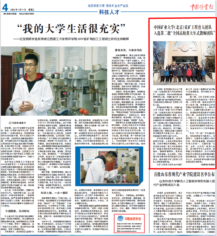 【中国矿业报】中国矿业大学(北京)采矿工程育人团队入选第二批“全国高校黄大年式教师团队”